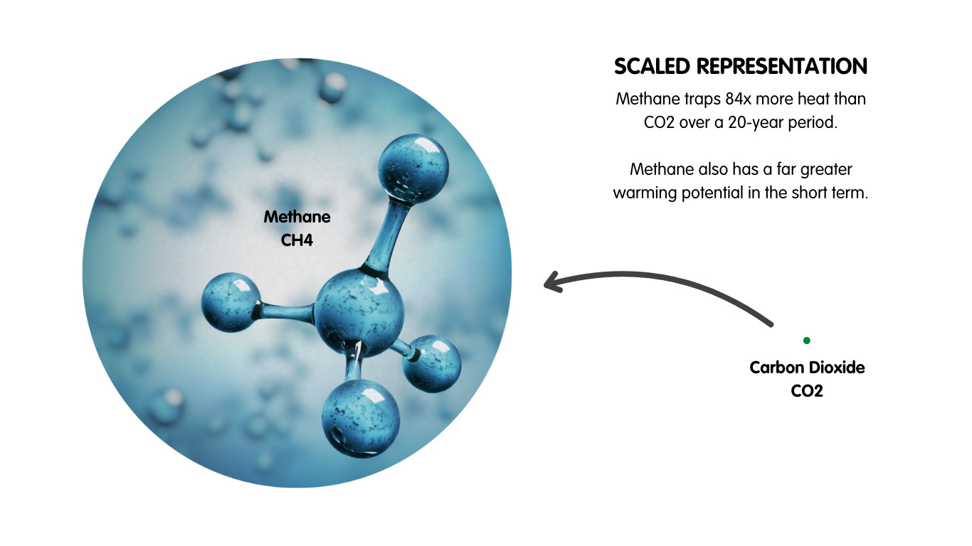 Methane accounts for around 1% of total greenhouse gases but around 21% of global greenhouse emissions. Even though much less methane is emitted than carbon dioxide, methane is 84+ times more potent than carbon dioxide in the first 20 years of its emissions.